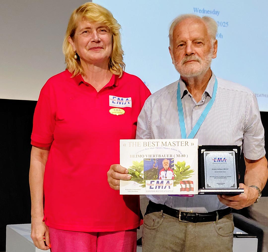 Im Rahmen der EMA General Assembly am 15. Oktober überreichte EMA Präsidentin Walentina FEDJUSCHINA Heimo VIERTBAUER den AWARD EUROPEAN BEST MASTER M80 in Throws 2024 (siehe Foto)